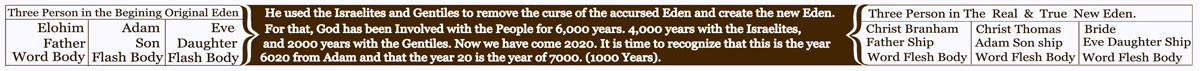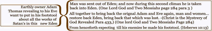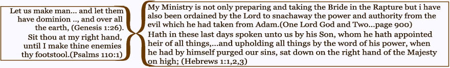 “ See the threefold mystery now? [“Amen.”] God manifested in Christ; Christ manifested in the Church; all together, to bring back the original Adam and Eve again” ... ( One Lord God and Two Messiahs Page 270)